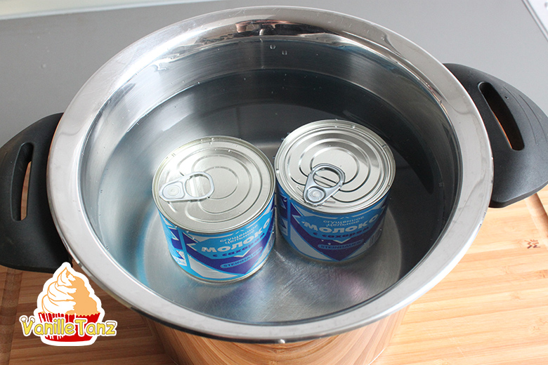 Die Dose gezuckerter Kondensmilch hineinstellen. Es ist sehr wichtig, dass die Dose ganz mit Wasser zugedeckt ist!!!