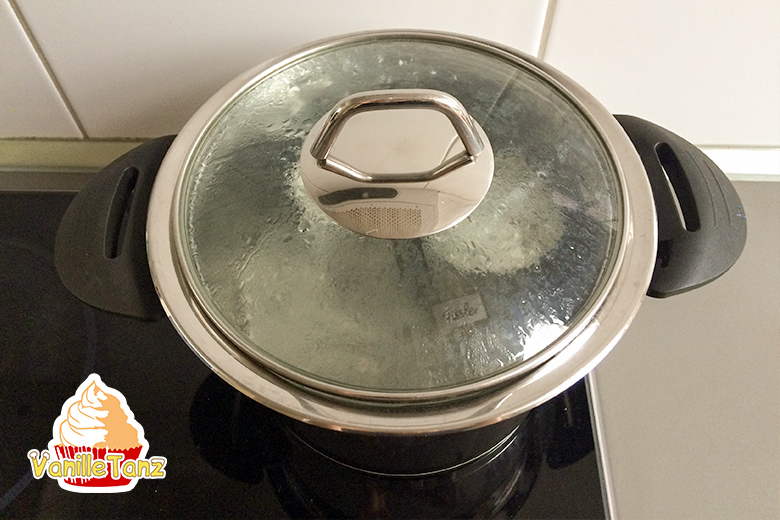 Das Wasser zum Kochen bringen und auf mittlerer bis kleiner Hitze ca. 3 Stunden die gezuckerte Kondensmilch kochen lassen.