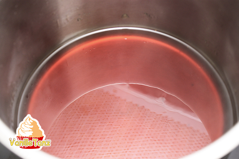 Vom Herd nehmen und zum Abkühlen auf Zimmertemperatur mit Frischhaltefolie wie im Bild bedecken. So bildet sich keine Haut auf der Creme.