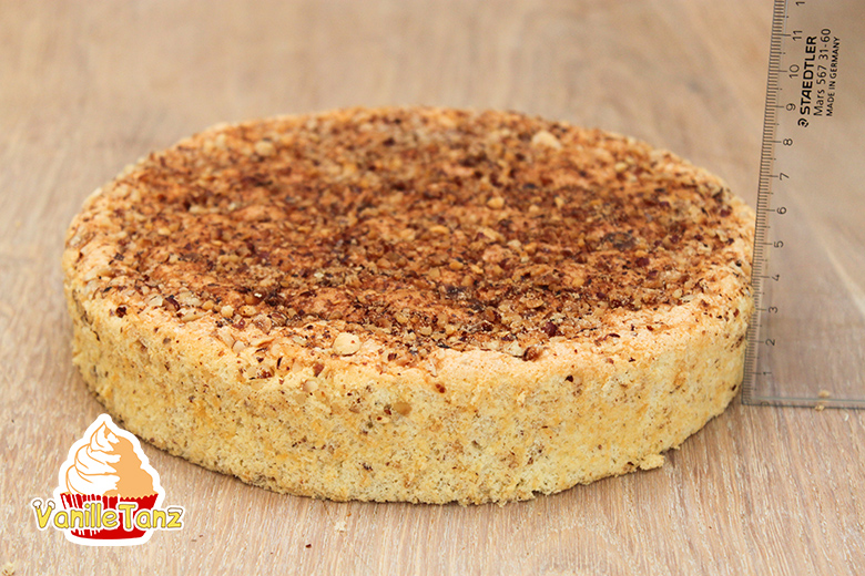 Teig in eine mit Backpapier ausgelegte Form 24 cm Ø verstreichen. Gehobelte Haselnüsse darüber streuen.