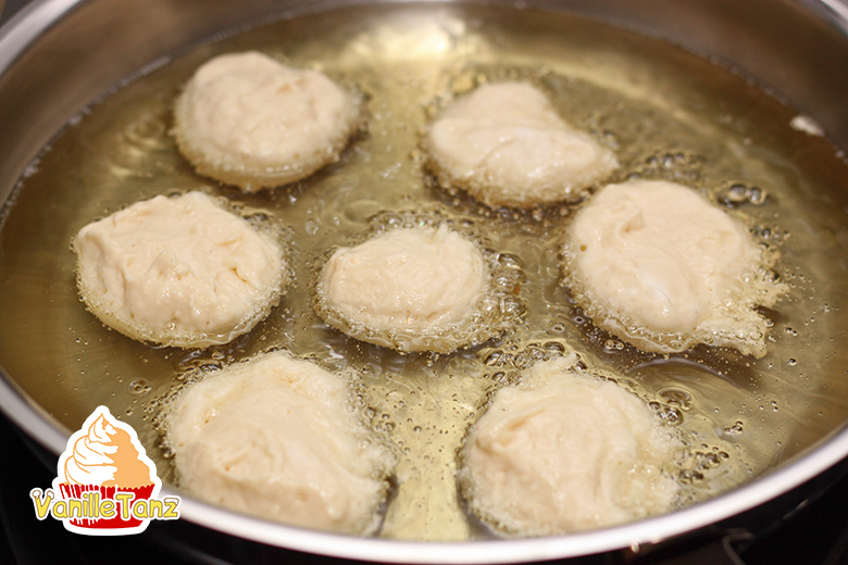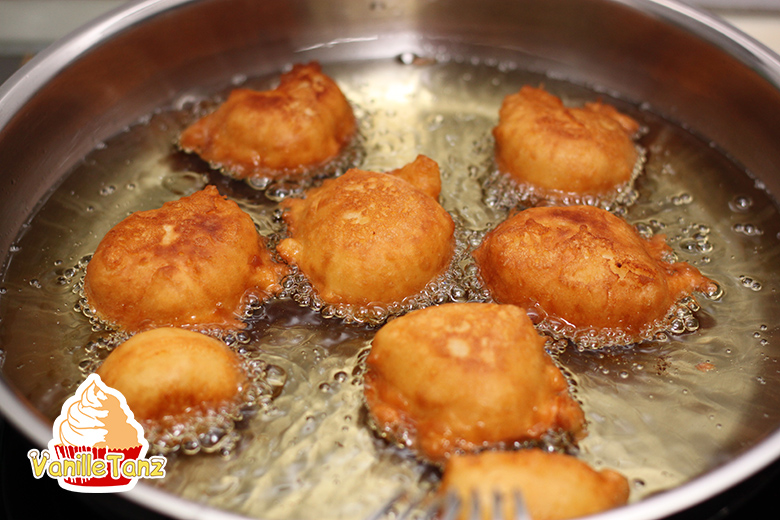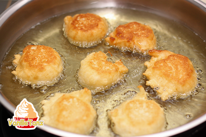 Mit einem Esslöfel den Teig in die Pfanne geben und bei mittlerer Hitze (nicht zu hocher Hitze!) die Teigbällchen von allen Seiten ausbacken.