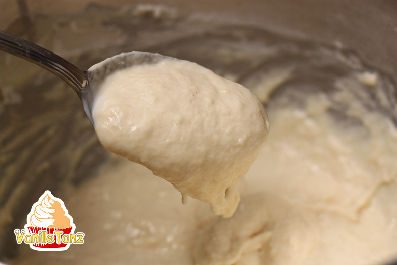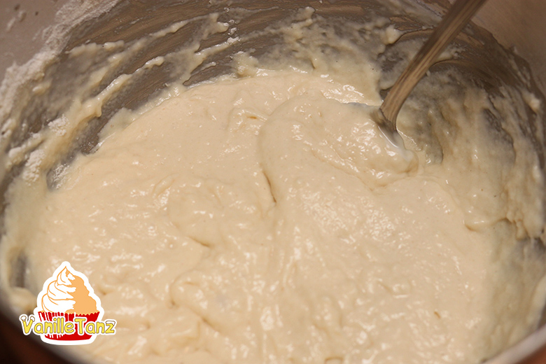 Mehl zu den feuchten Zutaten dazu geben und zu einem dickflüssigem Teig vermengen.